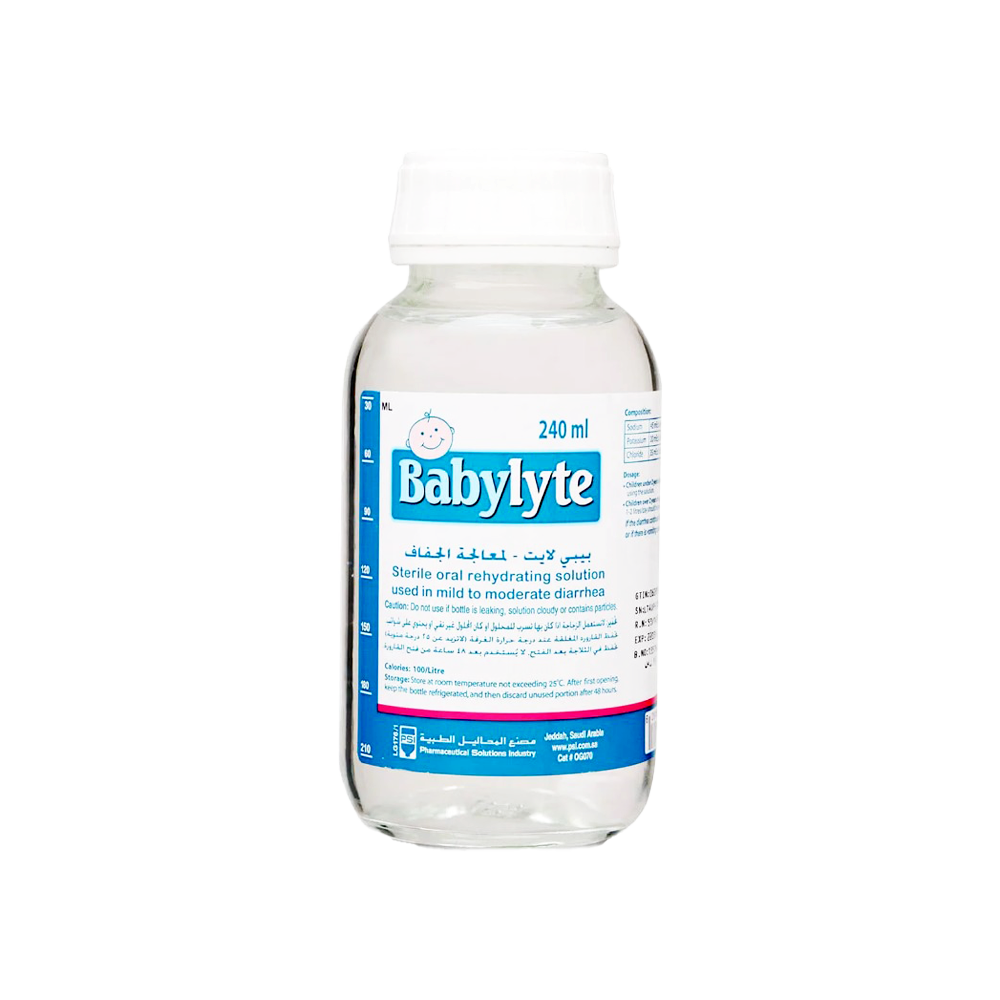 بيبي لايت محلول 240 مل محلول معالجة الجفافدواعى الاستخداميستخدم هذا المنتج لتعويض السوائل والمعادن (مثل الصوديوم والبوتاسيوم) المفقودة بسبب الإسهال والقيء.يساعد في منع أو علاج فقدان الكثير من ماء الجسم (الجفاف).يعتبر الحصول على الكمية المناسبة من السوائل والمعادن أمرًا مهمًا لعمل الجسم بشكل طبيعي.لا تستخدم إلكترولايت:إذا كان لديك حساسية من إلكترولايت أو أي من المكونات الأخرى لهذا الدواء إذا كان لديك انسداد في الأمعاء أو انثقاب (تمزق أو ثقب) في الأمعاءالتحذيرات والإحتياطات:يجب أن تخبر طبيبك بما يلي:إذا كنت تعاني من الحمى أو التقيؤ أو الإسهال الذي يستمر لأكثر من 24 ساعةإذا كنت حاملا أو مرضعة.الأدوية الأخرى و إلكترولايت:أخبر كل من مقدمي الرعاية الصحية عن جميع الأدوية التي تستخدمها ، بما في ذلك الأدوية التي تصرف دون وصفة طبية والفيتامينات والمنتجات العشبية.كيفية استخدام إلكترولايت: خذ هذا المنتج حسب توجيهات الطبيب ، أو اتبع جميع الإرشادات الموجودة على عبوة المنتج. إذا كان لديك أي أسئلة ، اسأل طبيبك أو الصيدلي.خذ شفويا عن طريق الفمتعتمد كمية المحلول التي يجب أن تتناولها على وزنك.يجب أن يأخذ الأطفال الصغار والأطفال والبالغون بشكل عام 100 مل إلى 150 مل لكل كيلوغرام من وزن الجسم (45 مل إلى 70 مل لكل رطل) كل يوم.اتبع الإرشادات المتوفرة مع المنتج الذي تستخدمه. إذا كنت تتقيأ أيضًا ، فابدأ بكميات صغيرة من المحلول وزد هذا المقدار عندما ينحسر القيء.الآثار الجانبية المحتملة:توقف عن استخدام المنتج واطلب العناية الطبية الفورية إذاعلامات رد فعل تحسسي ، مثل تورم الوجه أو الشفتين أو اللسان أو الحلق مما قد يسبب صعوبة في التنفس أو البلعكيفية تخزين إلكترولايت: احفظ هذا الدواء في درجة حرارة الغرفةأبقها بعيدا عن متناول الأطفال.إذا صنعت محلولًا من مسحوق ، فيجب التخلص من أي محلول متبق بعد ساعة واحدة من صنعه.يمكن تخزين المحلول المصنوع من البودرة في الثلاجة بعد الخلط لمدة تصل إلى 24 ساعة.عندما يتم فتح المنتجات المشتراة في شكل محلول ، يمكن تخزينها في الثلاجة لمدة تصل إلى 48 ساعة.بالنسبة للملوثات العضوية الثابتة في المجمد ، تخلص من أي محلول غير مستخدم.